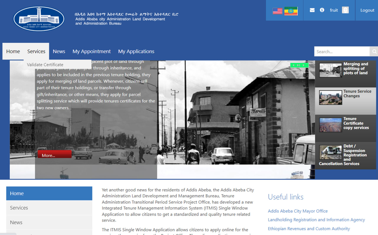 • አገልግሎቶች፡-የተመረጠው አገልግሎት የሚገኝበት የይዞታ አገልግሎቶች እና የሁሉም ክፍለ ከተሞች ዝርዝሮች፤
